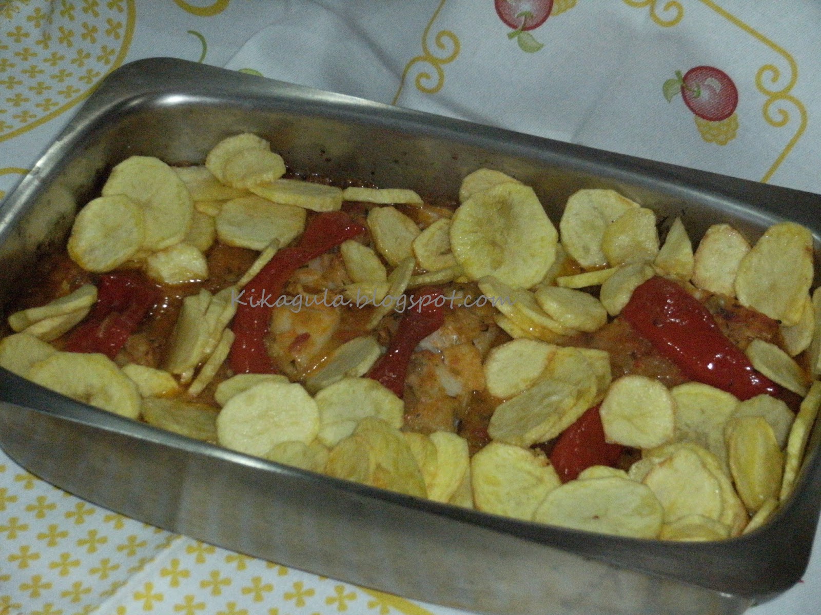 Por fim colocar as tiras de pimento em cada posta, as batatas